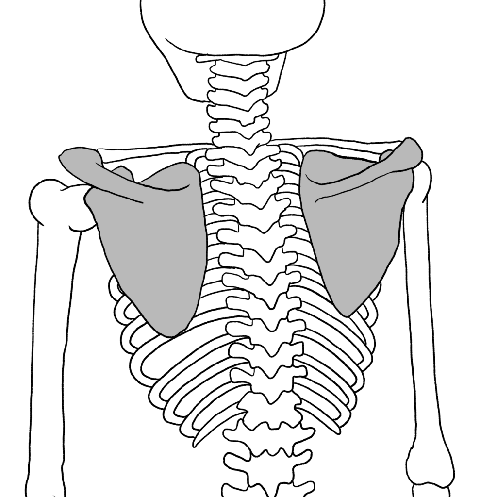 肩甲骨は、逆三角形の形をした手のひらサイズの平たい骨で、背中の上の方に左右対称に位置しています。しかし少々特殊な骨で肩関節の土台とも呼べる役割があるのですが、実は宙ぶらりんな骨なのです!!